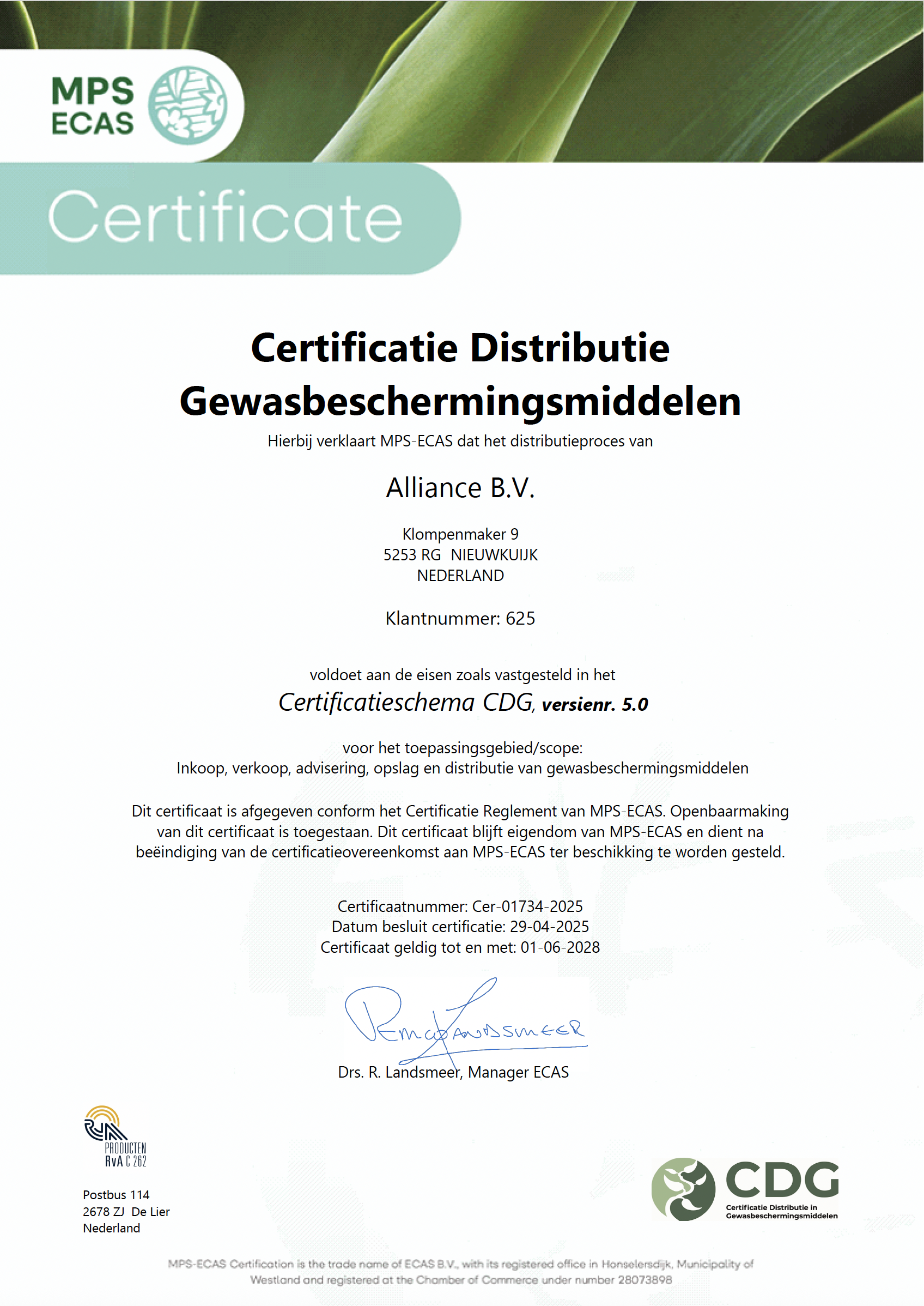 Om de kwaliteit van de organisatie op een hoog peil te houden is Alliance CDG en GMP+ gecertificeerd.
